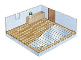 温水が循環するパネルを床材の下に設置して輻射熱と伝道熱で暖房します。